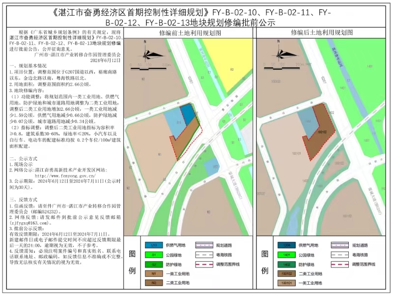 根据《广东省城乡规划条例》的有关规定,现将湛江市奋勇经济区首期控制性详细规划》fy-b-02-10、fy-b-02-11、fy-b-02-12、fy-b-02-13地块规划修编进行批前公告,公开征询意见。